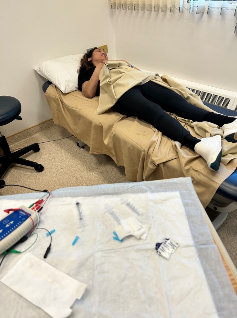 Once the third needle was done, Jenny’s breathing was very rapid and I noticed her body was beginning to sweat.