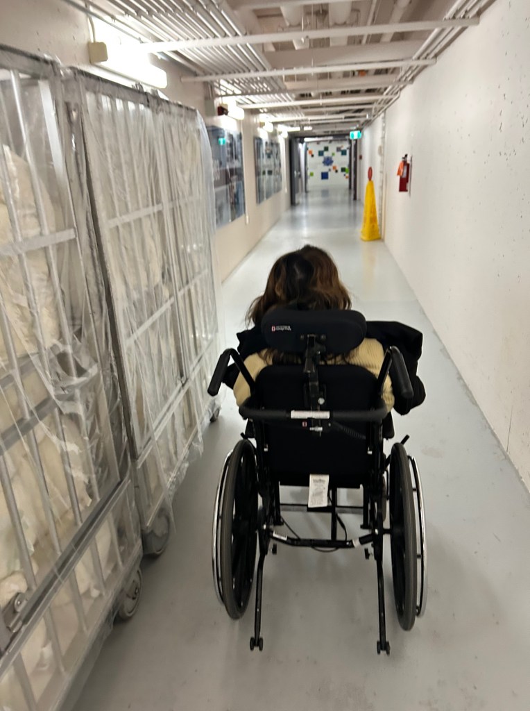 When we arrived at HSC, all I had for instructions on where to go were scribbled on the outside of the envelope of Jenny’s paperwork. It was a trek with a few unintentional detours but through it all Jenny was enjoying being pushed in her wheelchair as we had a mini adventure. As we were moving around the hospital she repeatedly asked