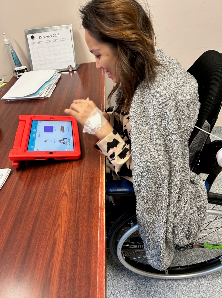Jenny using the educational tablet for the first time at Speech & Language Pathology