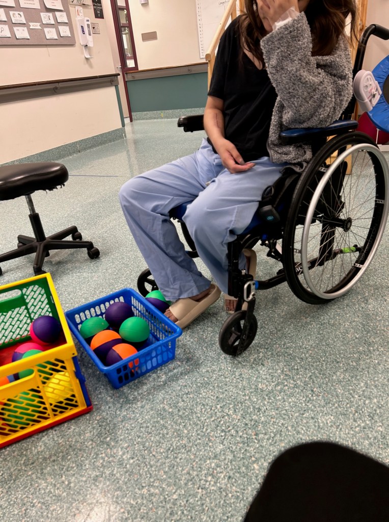 Today at rehab, Jenny once again played special basketball at Physiotherapy like she did last week. However, Jenny has not made noticeable improvement and this frustrated her greatly. Jenny could still barely hold onto the ball with her right hand and cannot move it at all – she cannot even throw the ball into a basket that’s touching her feet.