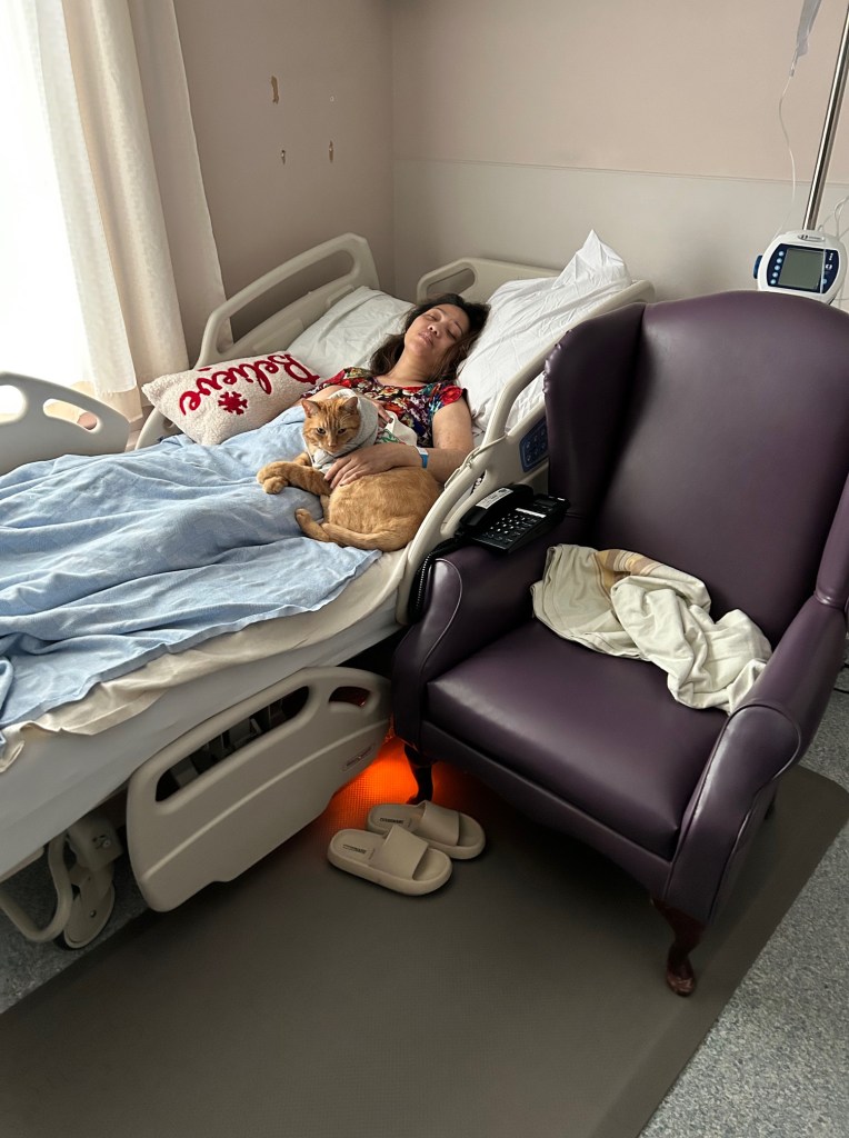 A bonus photo of Tofu being a very good boy and staying at Jenny’s side as she rests