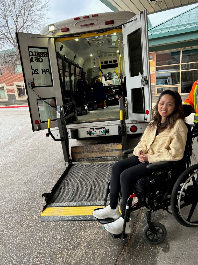 As Day Seventy-One ends, today was the day Jenny got to revisit the Health Sciences Centre since she arrived to Riverview as her primary doctor requested she undergo the more powerful X-ray located there to more accurately see the progress in her right arm. As nearly a month has passed since Jenny arrived to Riverview, I am quite curious over whether or not she would be able to remember anyone at HSC. Jenny is very excited for this appointment because for the first time in her life, she gets to ride on a special wheelchair accessible vehicle.