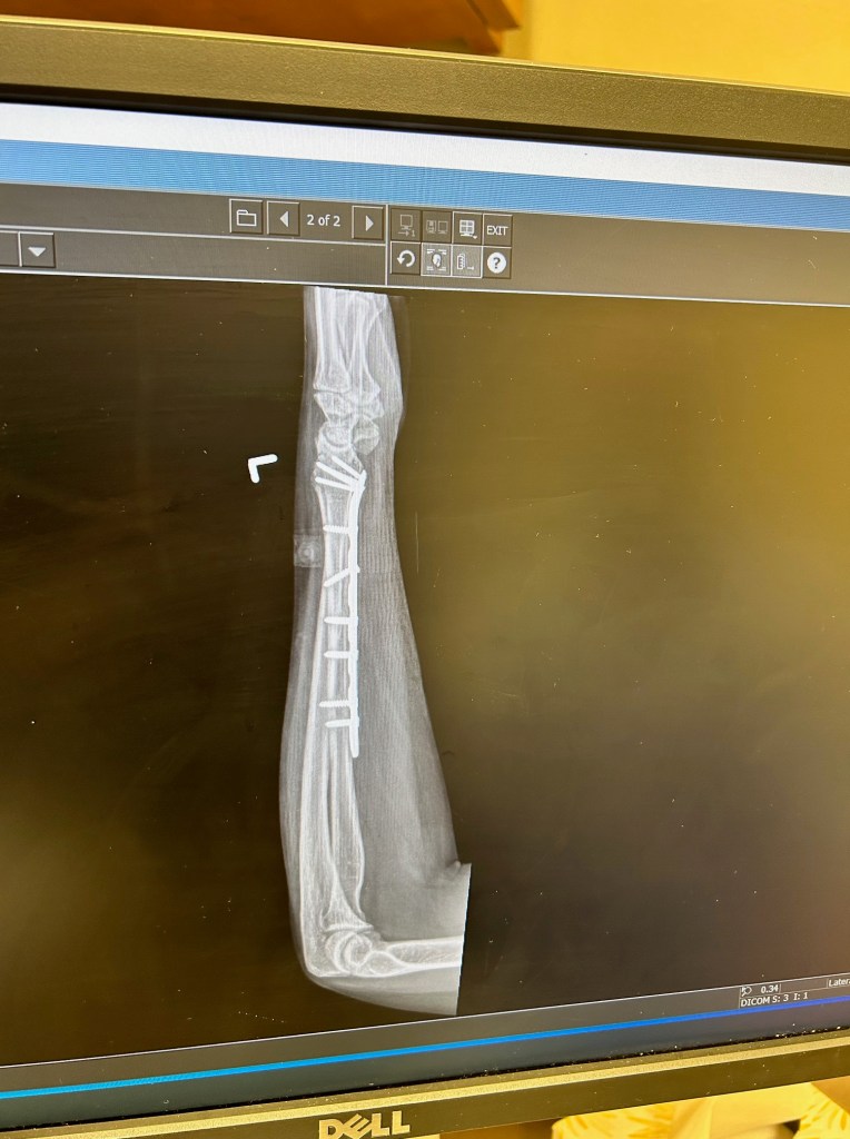 Jenny’s X-ray of her right arm, showing the metal plates and fractures she’s recovering from.