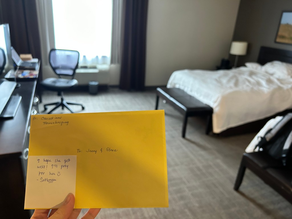 When I first entered HSC Canad Inns, I kept a low profile but slowly over the two weeks, staff from all across the different teams at the hotel learned about Jenny’s story and began to recognize me everyday. Originally along with Nick, Jean and Harry from the Front Desk staff, I extend my sincerest thank you to Norjohn, Harpreet, Sukhmeen, and Sully for showing care, patience and compassion to Jenny and I during my stay. Jasmeet from Security, who I never spoke to before until that point, walked up to me on my final day and asked about Jenny’s progress and that truly touched my heart. Ron and Raman from Aaltos, who were there for my first meal at the hotel and even today for my last, eventually learned of Jenny’s story and supported me whenever I stopped by. Akosua from Garbonzo’s, who was always accommodating to any request, even up until 12:00am when they closed for the night. Along with Jasmine and Helen from the Canad Inns Room staff, I’d like to mention Irene and Nino who recognized me and gave their support and wishes.
